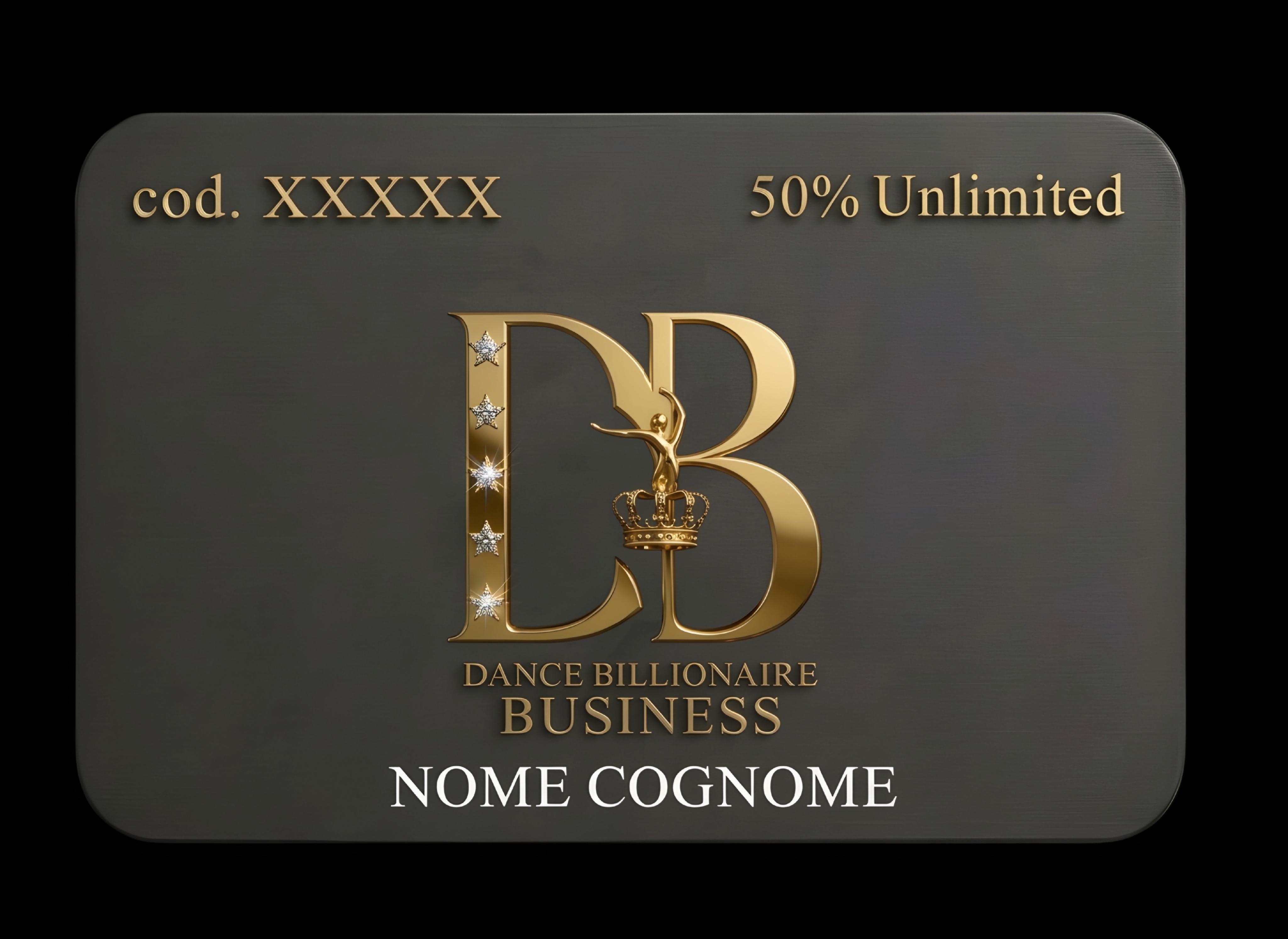 *Con questa card acquisterai PER SEMPRE, e senza limiti, col 50% di sconto. Ti basterร infatti, durante ogni tuo prossimo acquisto di scarpe DANCE BILLIONAIRE, inserire il codice a 5 cifre, inciso sulla business card ricevuta, nella sezione "CODICE SCONTO" del carrello acquisti, e l'importo del prodotto o del totale dell'ordine verrร scontato del 50% in automatico. Lo sconto del 50% verrร applicato anche per i prodotti che sono giร scontati;